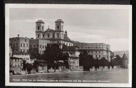 Passau. Blick von der Inn Brücke gegen die Jesuitenkirche.. - Nicht gelaufen. (NPLZ 94030)