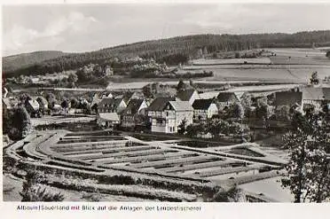 Albaum mit Blick auf die Anlagen der Landesfischerei - Gelaufen. Ca. 1965. (NPLZ 57399)