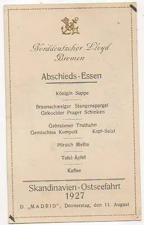 x15527; Abschieds-Essen. Skandinavien Ostseefahrt 1927. D. Madrid. - Menukarte 15,5 x 9,5 cm. Keine AK. 2 x Nadelloch