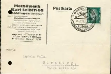 x16024; Luftfahrt -Stempel:Internationaler Flugplatz. Boeblingen Kurort . 16.7.29 Mi412 nach Nürnberg. Auf Firmenkarte . Metalwerk Karl Leibfried.Böblingen.