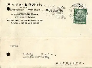 x16126; Messe Stempel: Besucht die 4 Reichsnährstands Ausstellung in München 30.Mai 6 1937 Juni München 1937. auf Firmenkarte Richter und Röhrig. Düsseldorf - München(gelocht).