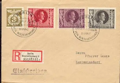 x16276; NS-Zeit: Unser Führer bannt den Bolschewismus. Berlin 20.4.1943.Mi830+844+847+848.Auf R-Brief.