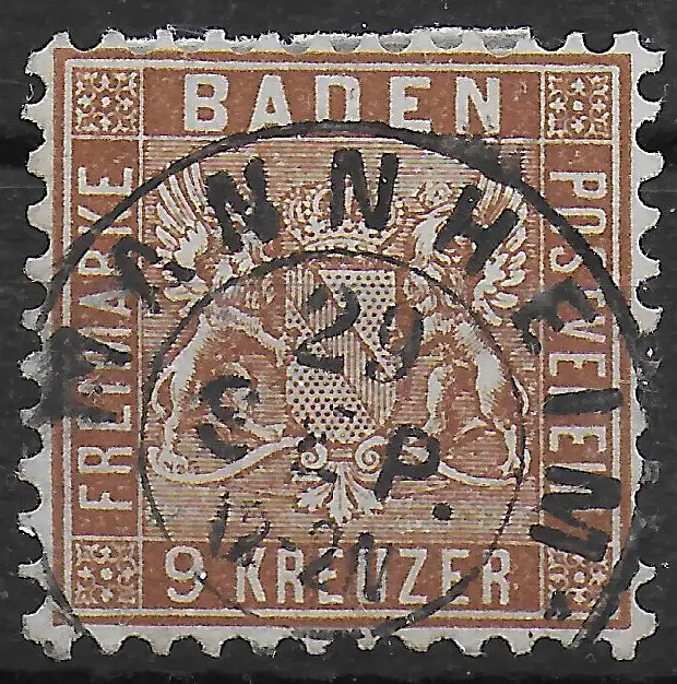Baden: MiNr. 15c, gestempelt, etwas erhöht BPP geprüft, Mannheim