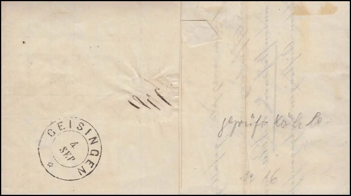 3 Kreuzer sauber gezähnt und mit zentrischem Nummernstempel auf Faltbrief (Rechnung) von Stockach 3.9.1862 über Waldshut (Nummernstempel 153) nach Geisingen (Ankunftsstempel), Altsignatur Köhler und Altattest Dr. Derichs, Köln von 1970.