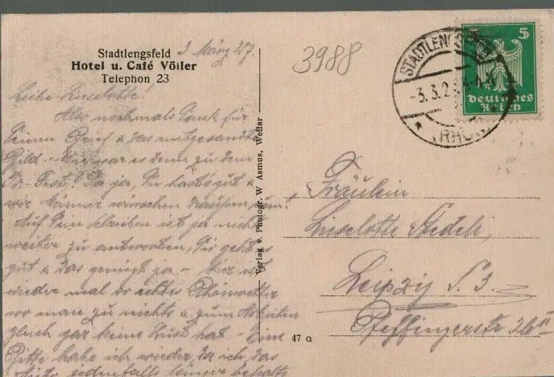 03988 Stadtlengsfeld. Hotel u. Cafe Vöiler - Gelaufen 1927. (NPLZ 36457)