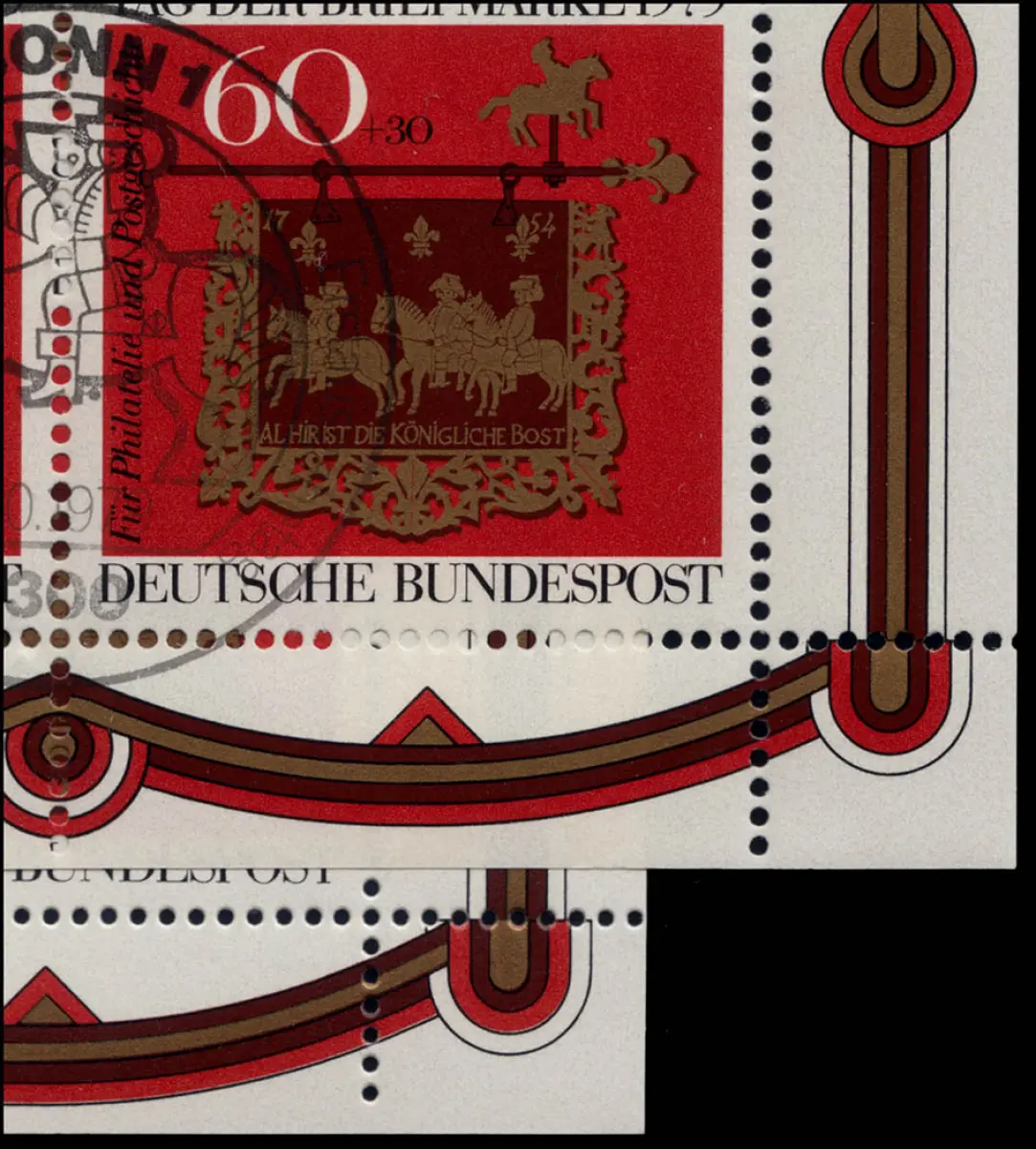 Ensemble de deux arcs de dix dentés différents: en dessous, en position verticale (7 trous de donation) et en bas, non en place en forme de dentelée (6 trous d'engrenage). Tous deux parfaitement munis d ' un tampon spécial de premier jour BONN. N° de catalogue: 1023 Essai: original Numéro d ’ article: 50100102303300