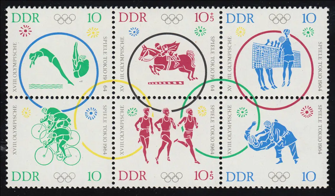 1039-1044 Olympia Tokyo 1964 - Bloc de six **, toutes les valeurs vérifiées Schönherr BPP