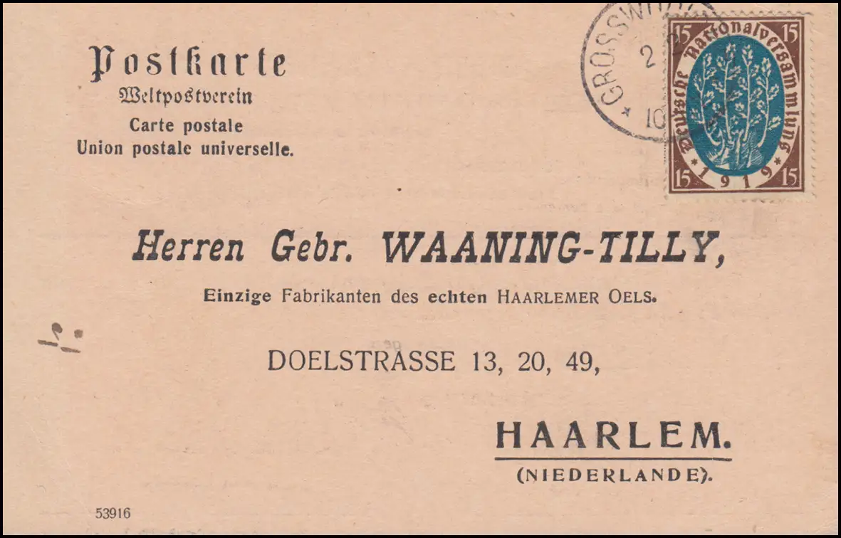 108 Assemblée nationale EF Carte postale GROS WUDICKE 2.2.1920 vers Haarlem/NL