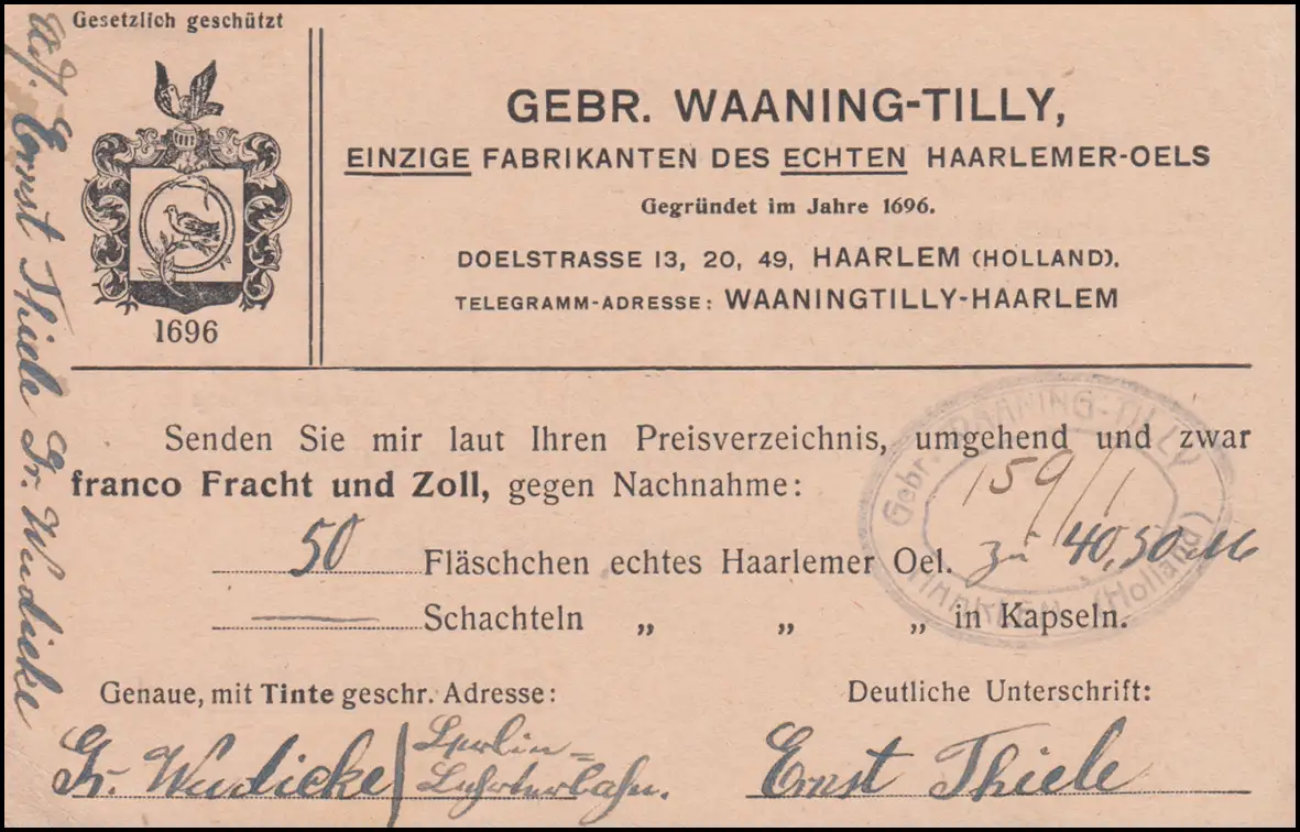 Enfance individuelle adaptée aux frais sur carte postale internationale Großwaudicke / Brandenburg: Carte de commande pour "Véritable huile de haarlem" aux frères Waaning-Tilly à Haarlem / Pays-Bas N° de catalogue: 108 Examen: original Référence produit: 00000000017732>p>Remarque: Cet article n'est disponible qu'une fois. Vous recevrez l'article représenté avec précision.