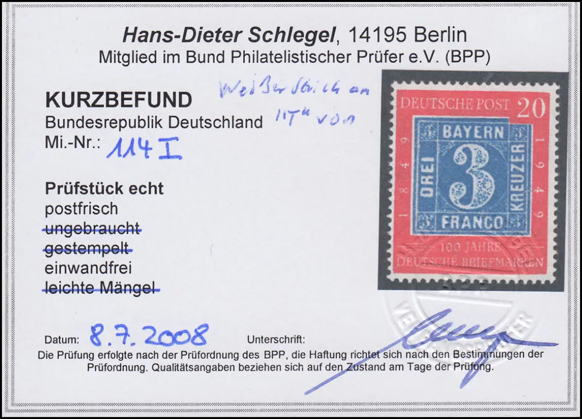 Schöner Plattenfehler, einwandfreie Marke - doppelt signiert Schlegel BPP und zusätzlich Befund Schlegel BPP einwandfrei