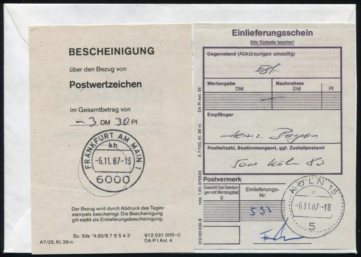 1.1I ATM 330 Pf avec PLF I Bumerang sur lettre R SSt KÖLN Philatelia 6.11.87