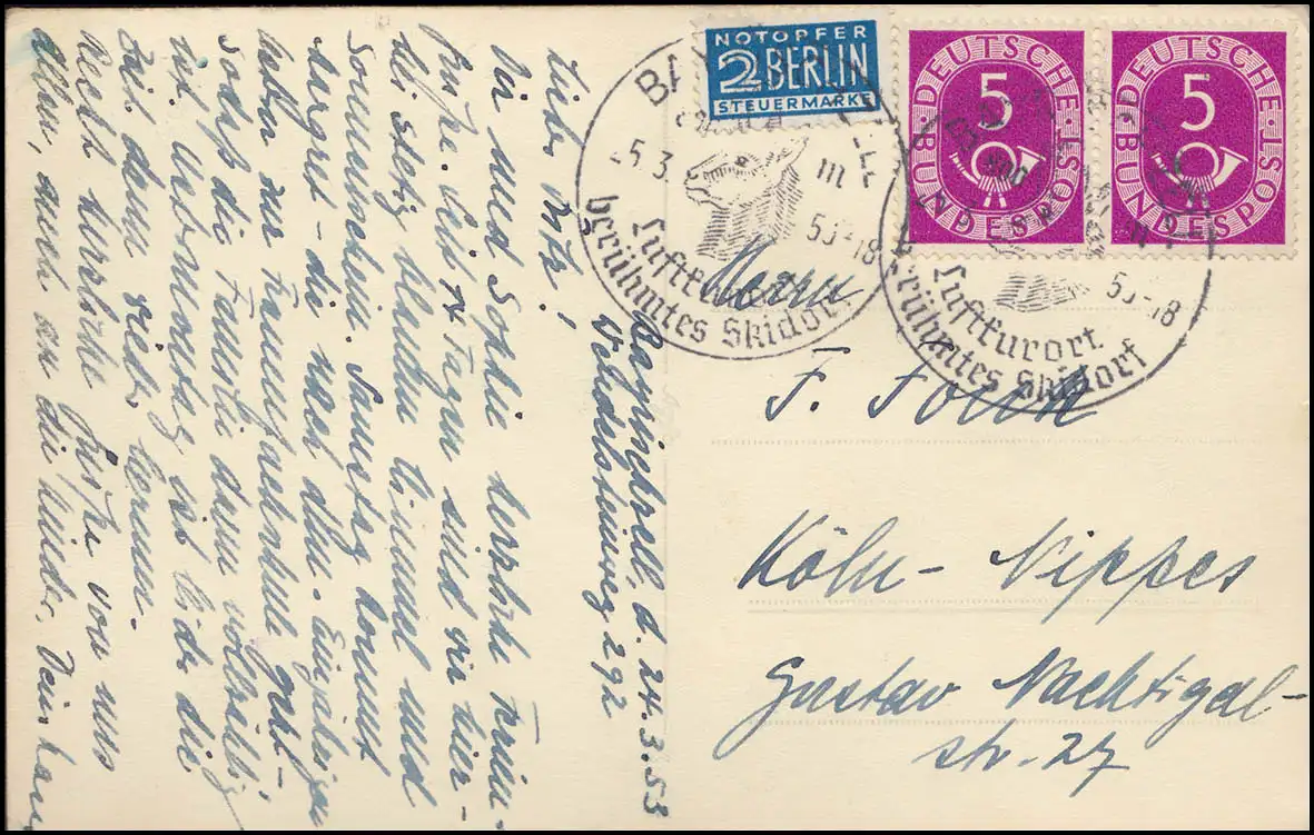 125 Posthorn 5 p.p. dans la paire horizontale sur la carte de vue Bayrichzell 25.3.53