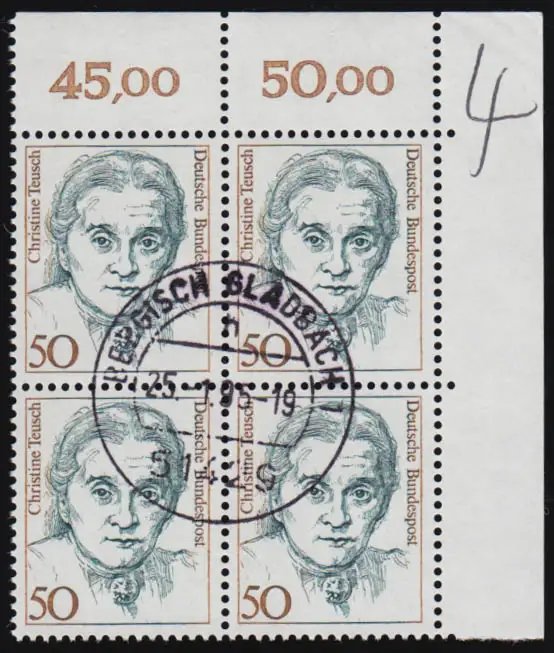 1304 50 Pf Teusch ER-Quatrierbl. en haut à droite, marqué, jour-O centrique