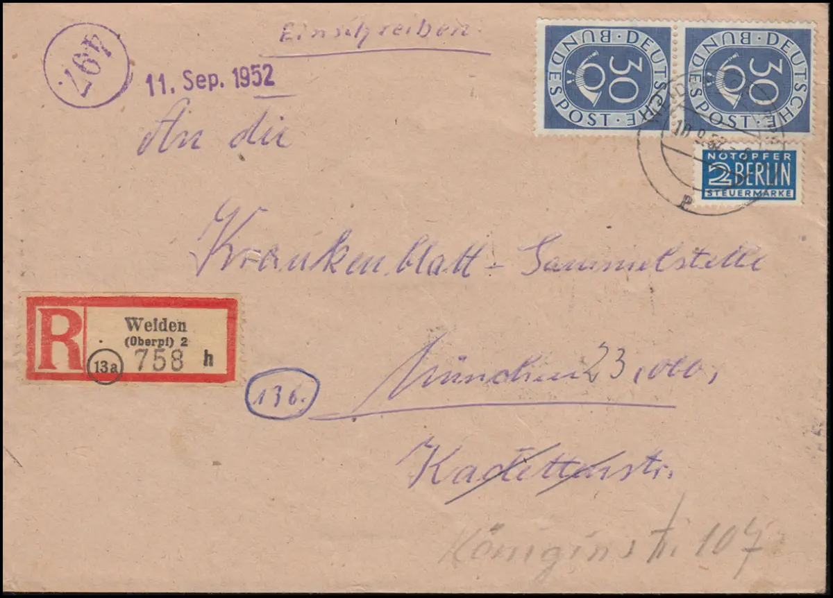 132 Posthorn 30 pfennig dans la paire verticale MeF sur lettre R WEIDEN 10.9.1952