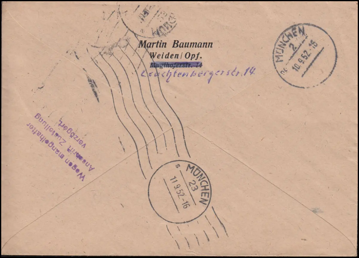 Envoi de la facture d'urgence par courrier recommandé selon MUNICH 10.9. et 11.9.52 (deux cachets aptisés), en trois exemplaires "Sur la voie de l'adresse magique retard de livraison" Numéro de catalogue: 132 Examen: original Numéro d ' article: 00000000030441>P>Remarque: Cet article n'est disponible qu'une seule fois. Vous recevrez exactement l \'article illustré.