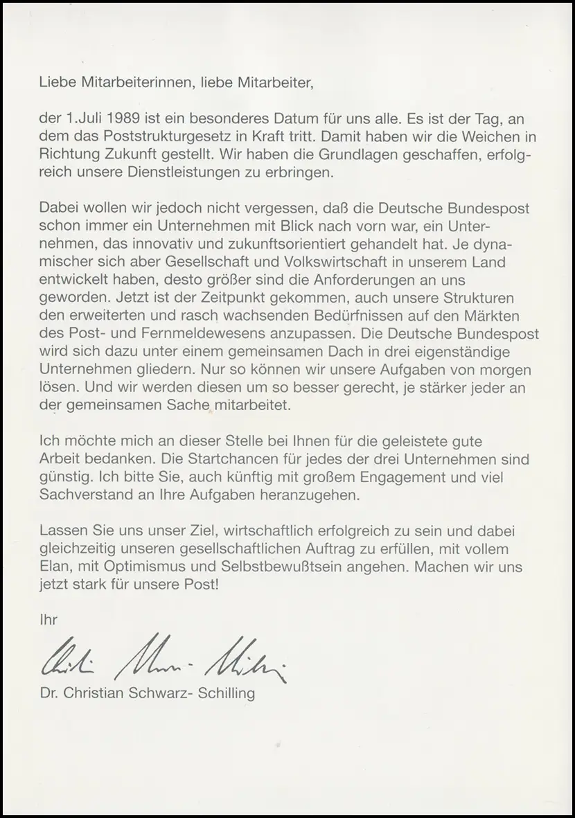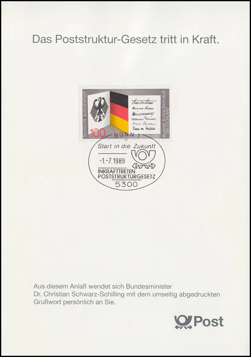"A cette occasion, le ministre fédéral Dr. Christian Schwarz-Schilling vous adresse personnellement le salut imprimé sur le côté." Pas tout à fait parfait. N° de catalogue: EB1/1989 Examen: original Numéro d'article: 00000000012693>Remarque: Cet article n'est disponible qu'une seule fois. Vous recevrez exactement l'élément représenté.