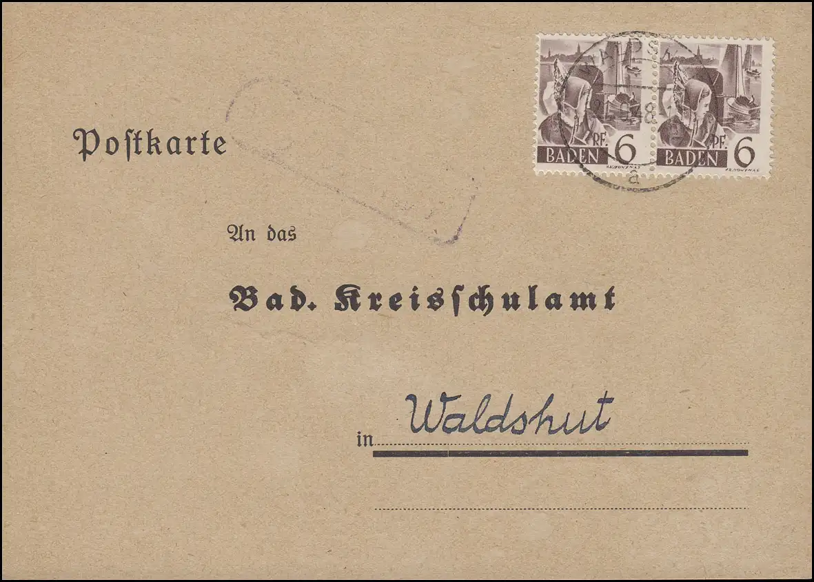 15 - 6 Pf couple MeF sur annonce de vacances Carte postale WALDSHUT 21.9.48 à l'office de l 'école de district