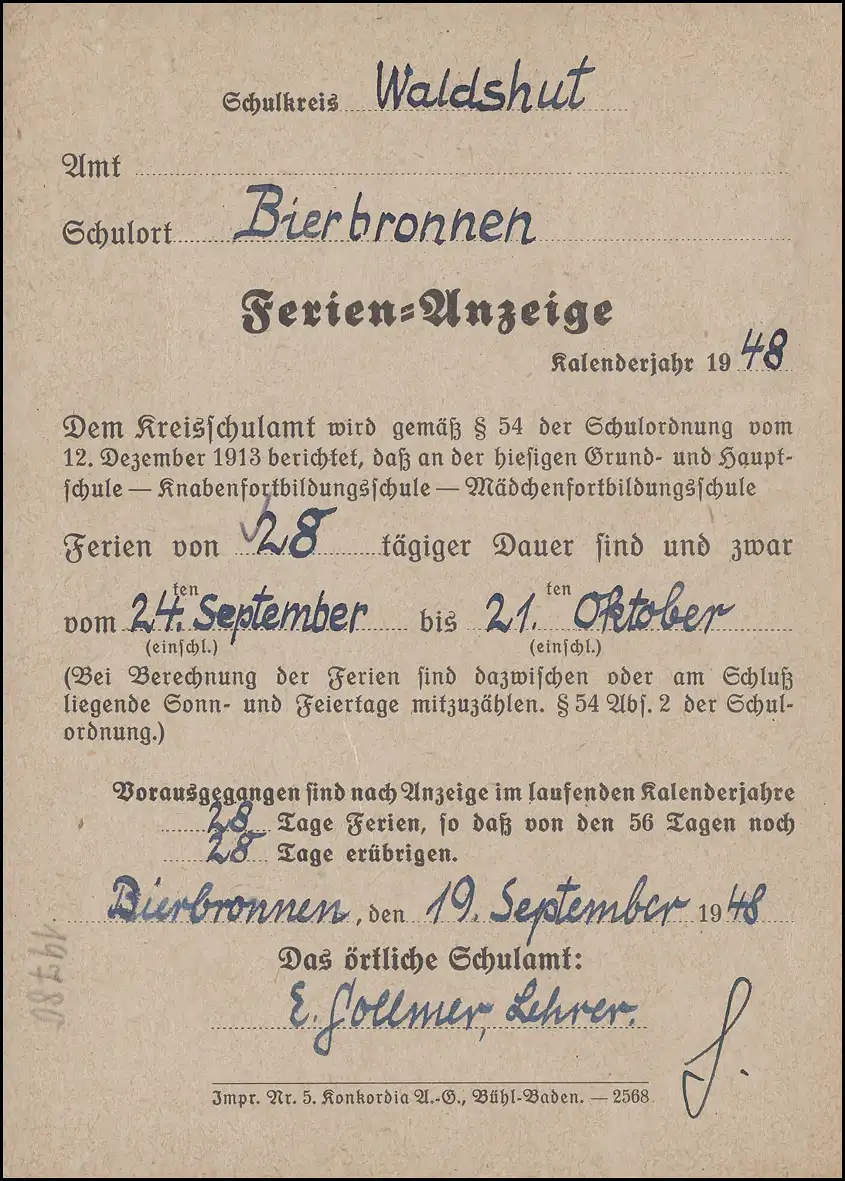 Carte postale de formulaire "Ferein-Anzeige" (selon le règlement scolaire de 1913!) du lieu d'école Bierbronnen (stemel de poste non lisible) au bureau de l'enseignement secondaire de Waldshut. N° de catalogue: 15 Examen: original Numéro d ' article: 00000000032503>Note: Cet article n'est disponible qu'une fois. Vous recevrez exactement l \'article illustré.
