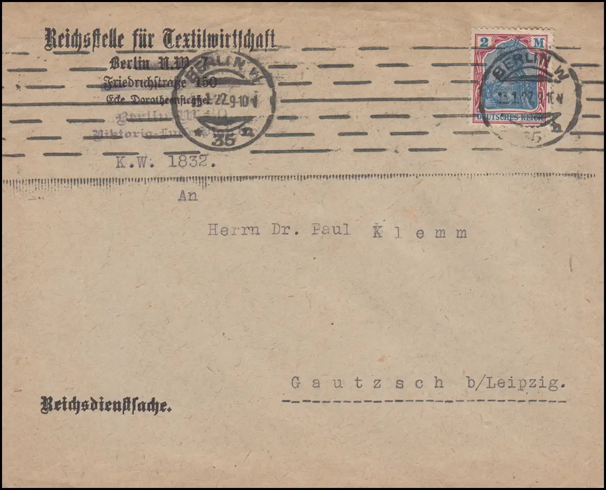 152 Germania Reichsbeschichte Reisstelle für Textilwirtschaft BERLIN 13.1.22