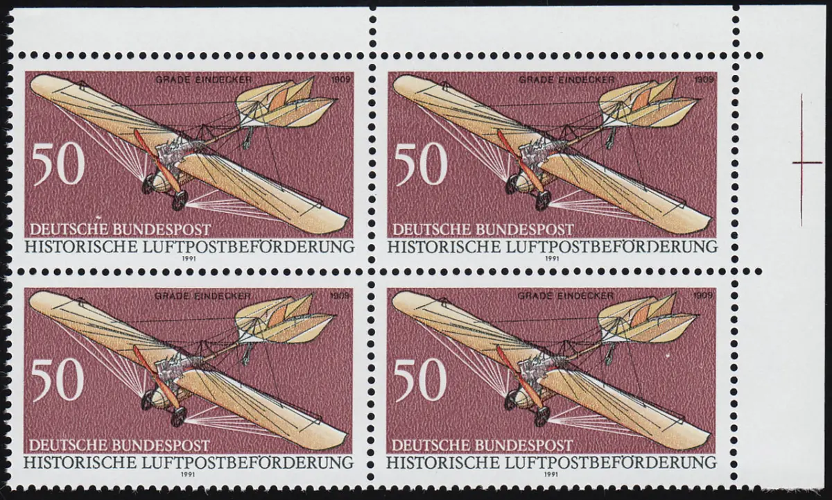 1523P Luftpost 50 Pf Probedruck lilabraun - Eck-Viererblock oben rechts, **