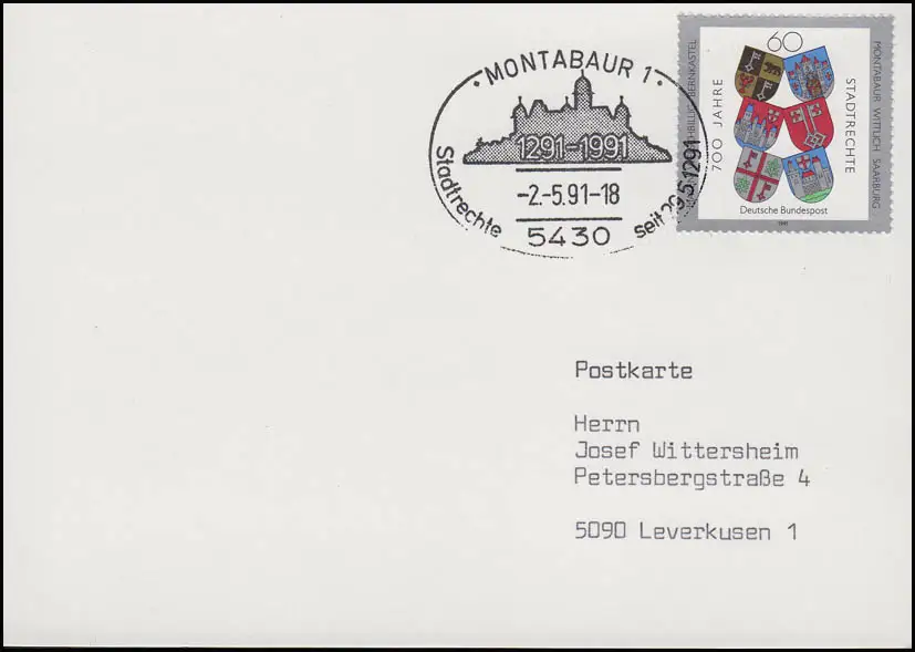 1528 Droits de la ville & Blagues, carte postale FDC ESSt Montabaur Ville-Silhouette 2.5.91