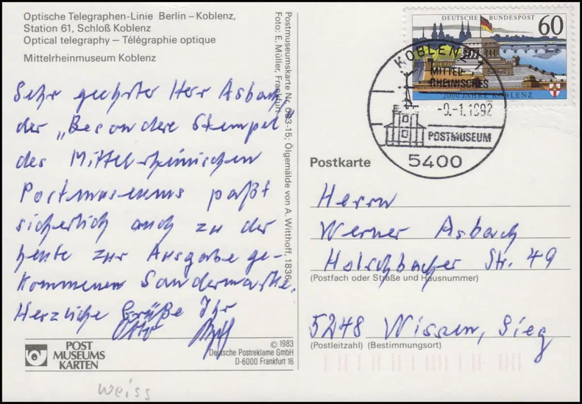 Enfance individuelle à portée de main comme carte postale à longue distance en provenance de Coblence selon la connaissance / victoire, carte visuelle / carte de musée postal: Ligne optique de télégraphe Berlin-Coblenz, Château de Koblenza N° de catalogue: 1583x Vérification: originale Référence produit: 00000000027762