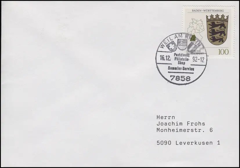 1586 Baden-Württemberg EF Bf SSt Weil am Rhein Wappen & Philatelie-Shop 16.12.92