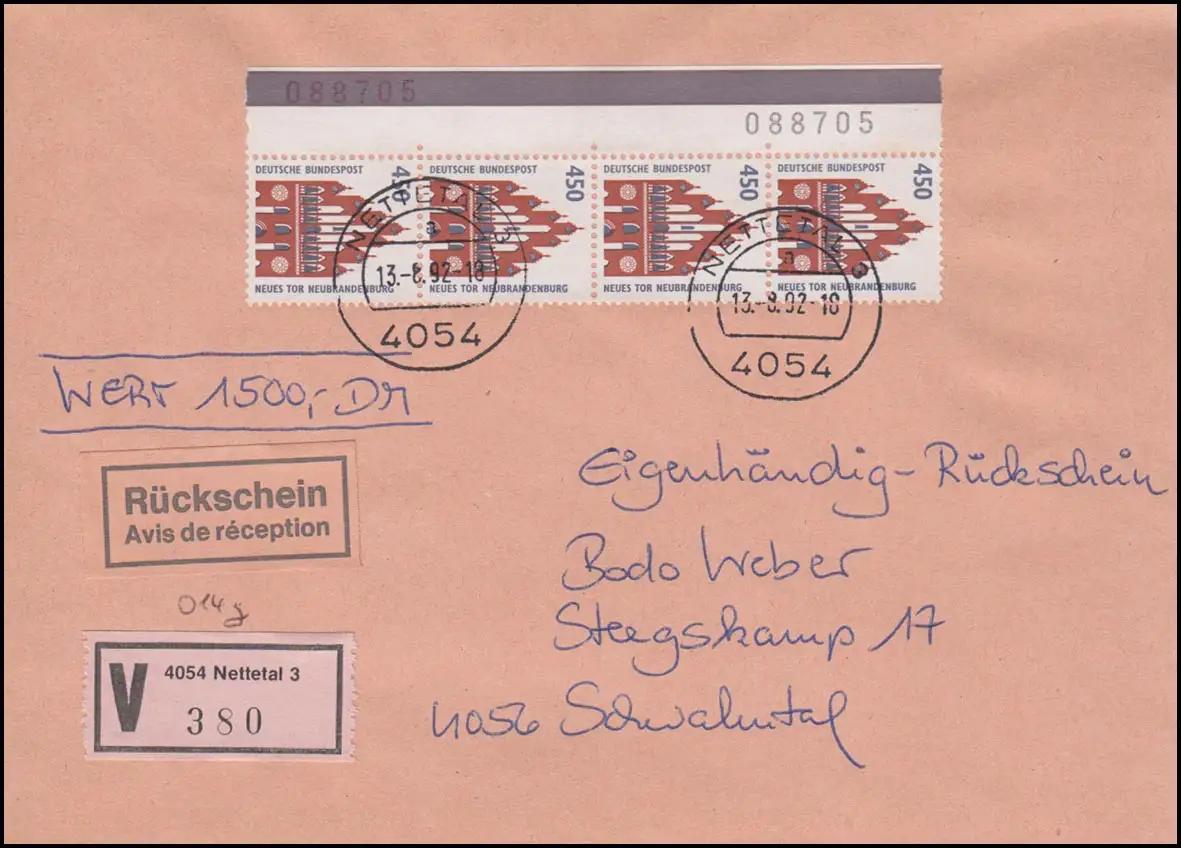 1623 SWK 450 Pf en bande de 4 bandes avec 2 BZN MeF FDC ET-O NETTETAL 13.8.1992