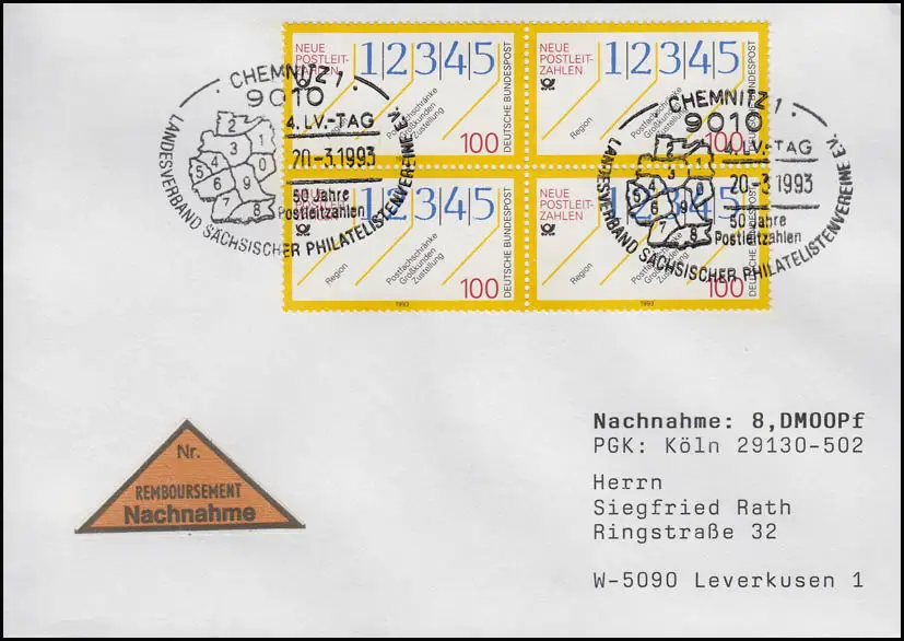 1659 Nouveaux codes postaux, MeF NN-Bf SSt Chemnitz Carte des codes postal 20.3.1993