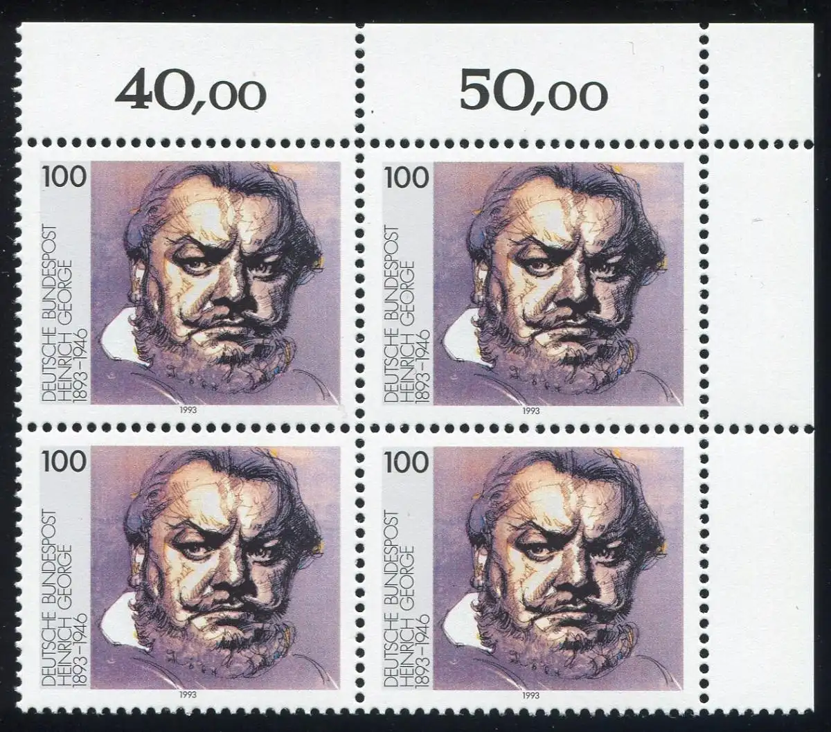 Bloc à quatre coins en haut à gauche avec erreur de plaque MICHEL V: trait rouge sous le T de -POST dans la case 10 et PLF: bâton bleu dans le champ O de GEORGE dans les cases 5 Numéro de catalogue: 1689V Vérification: original Référence de l'article: 50000168900129>Attention: Cet article est ou a été multiple. La figure montre l 'un de ces articles en un exemplaire. Cette marque fournie a uniquement les caractéristiques indiquées dans sa description et peut donc différer de la figure. Toutefois, en particulier pour les marques marquées, nous nous efforçons de fournir l\'élément représenté. Si cela vous convient, veuillez nous le faire savoir.