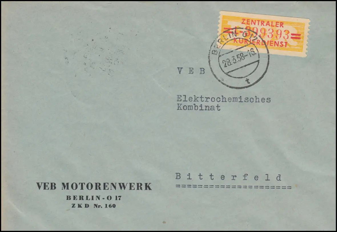 du VEB Motorenwerk Berlin O 17 an Veb Electrochemisches Kombinat in BITTERFELD 29.3.58 N° de catalogue: B17-L Test: original Référence produit: 00000000040036