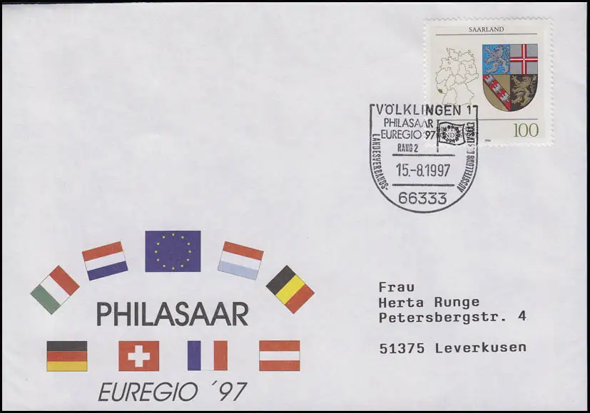 1712 Armoiries Sarre, EF Bf St Völklingen EUREGIO & Philasaar Europa 15.8.1997