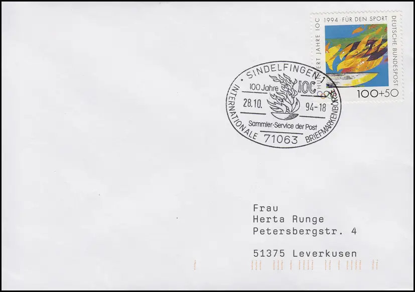 1719 Flamme olympique, EF Lettre SSt Sindelfingen 100 ans IOC 28.10.1994
