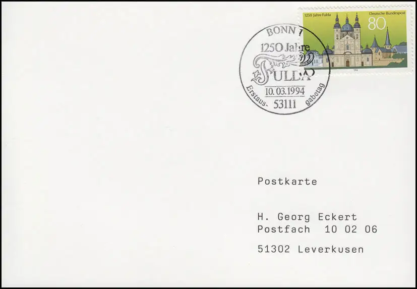 1722 Fulda, EF Carte postale FDC ESSt Bonn 1250 ans Fullda 10.3.1994