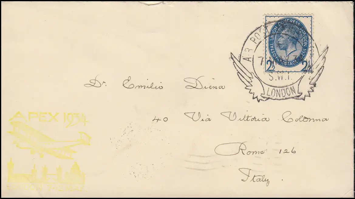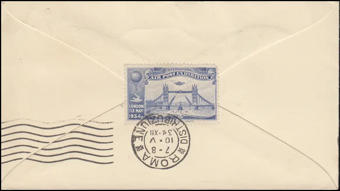 avec une vignette d'exposition arrière à l'"Exposition internationale de courrier aérien APEX London 1934," Tampon d 'arrivée ROMA / ROMa 10.5.34 N° de catalogue: 173 Examen: original Numéro d ’ article: 00000000028701>Note: Cet article n'est disponible qu'une seule fois. Vous recevrez exactement l & #39;article représenté.