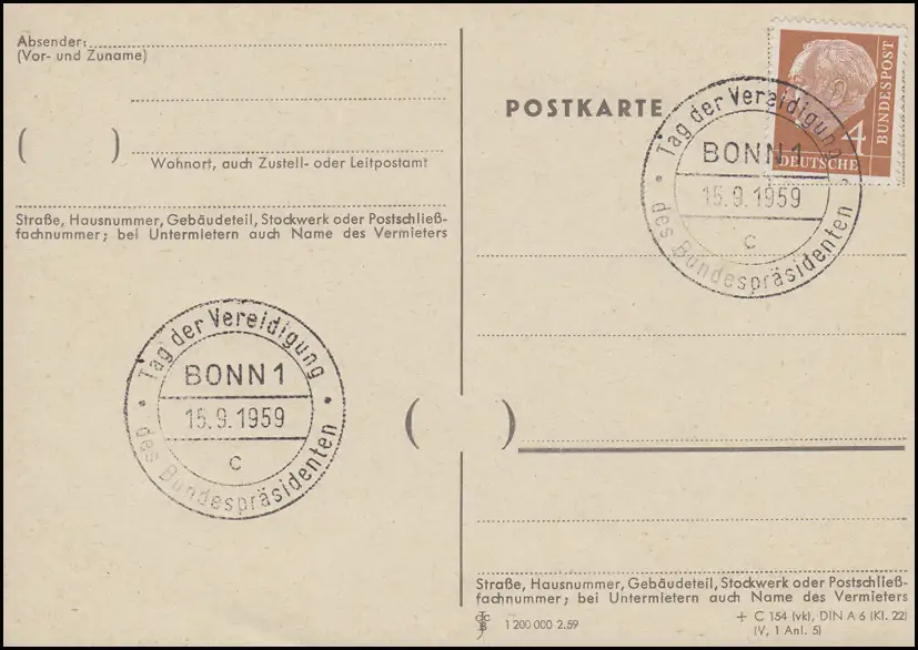 178x Heuss 4 Pf. Blanko-PK SSt Bonn serment du président fédéral 15.9.1959
