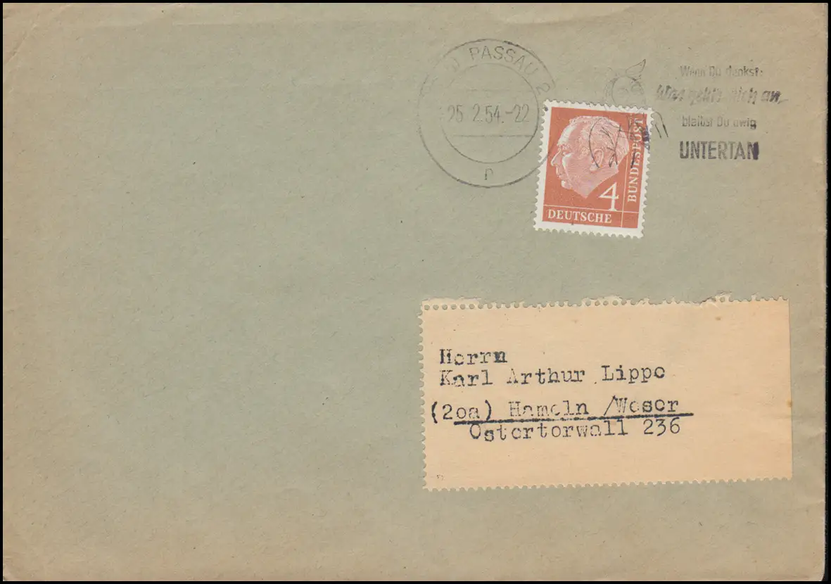 178x Heuss 4 Pf Tampon de publicité électorale PASSAU 25.2.1954 après Hameln
