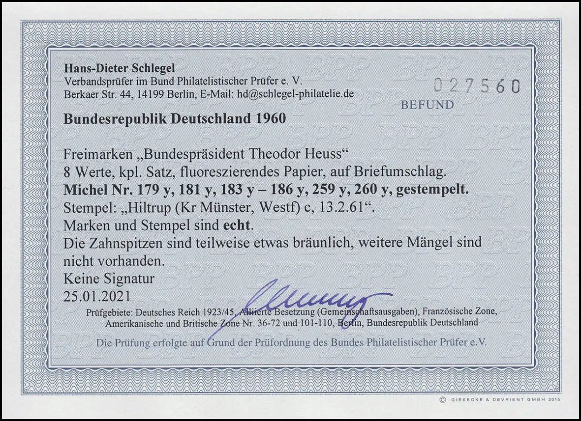 179-260y Heuss lumogen: 8 valeurs complètes Lettre de collection HILTRUP 13.2.61 Détection BPP