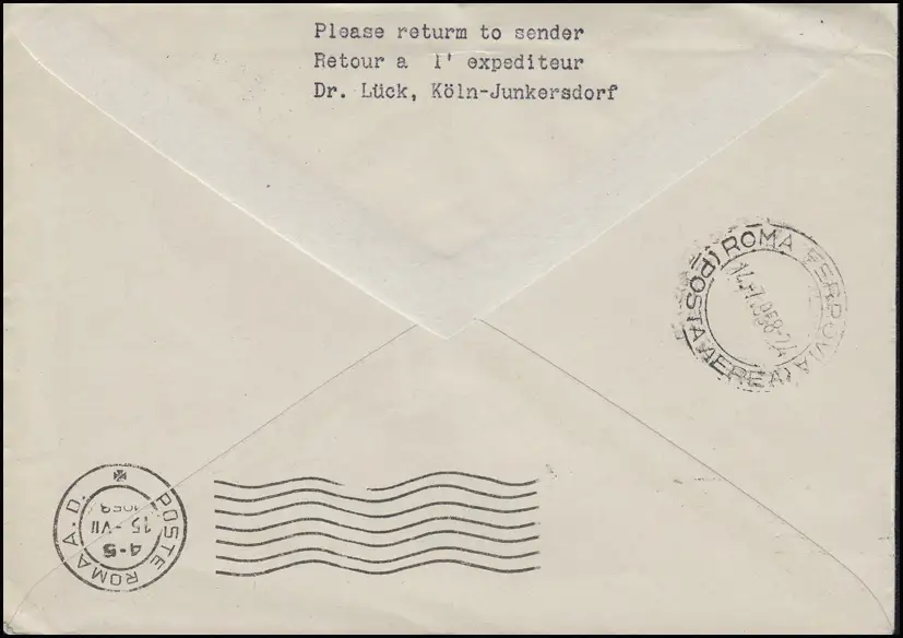 vers Rome / Italie avec le cachet d'arrivée Rome/Aéroport 14.7.58 et Rome 15.7.1958 Examen: original Numéro d ' article: 00000000019535