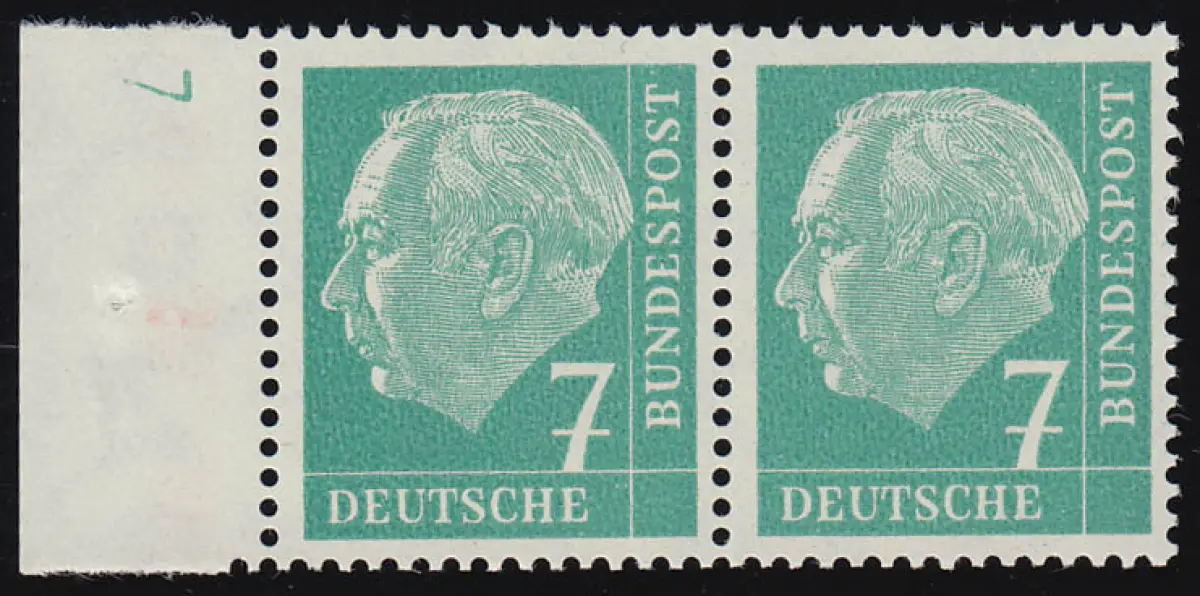 181y Lumogen DZ Heuss 7 Pf. waager. Paar mit Druckerzeichen DZ 7, ungefaltet, **