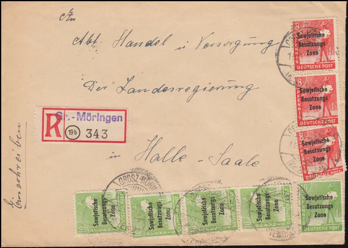 184+185 Imprimes SBZ R-Lettre Not-R-Zerttel GROSZ-MÖRINGEN (Kr. STENDAL) 11.10.48