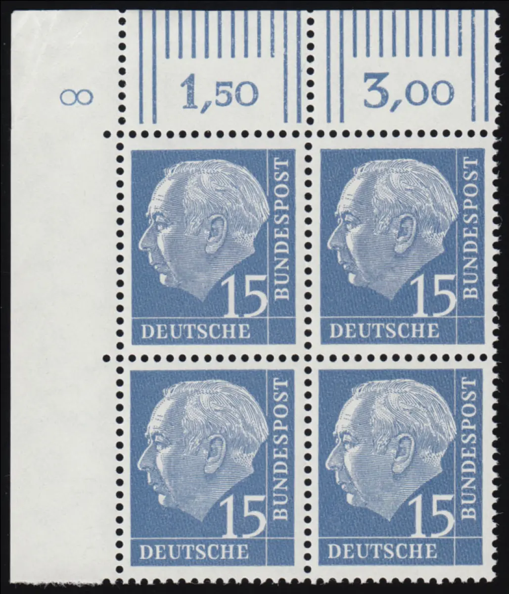 184xw Heuss 15 Pf ER-Vbl. o.l. avec DZ 8 positif, en marge minimal, **
