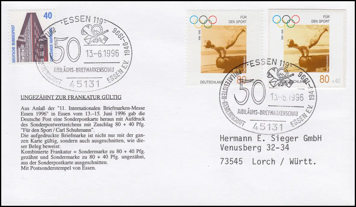 Valable sans déchirure à la france: Coupe complète Aide sportive Carl Schuhmann en PSo 42 avec marque dentée appropriée 1861 avec rankage supplémentaire: lettre lourde et adaptée au porto Tampon spécial de premier jour ESSEN 13.6.1996 pour la PZo 41! Numéro de catalogue: 18 61 Examen: original Numéro d'article: 00000000021294