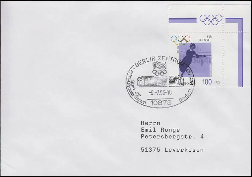 1863 vainqueur olympique Annie Hübler-Horn, lettre SSt Berlin Olympia-Express 9.7.1996