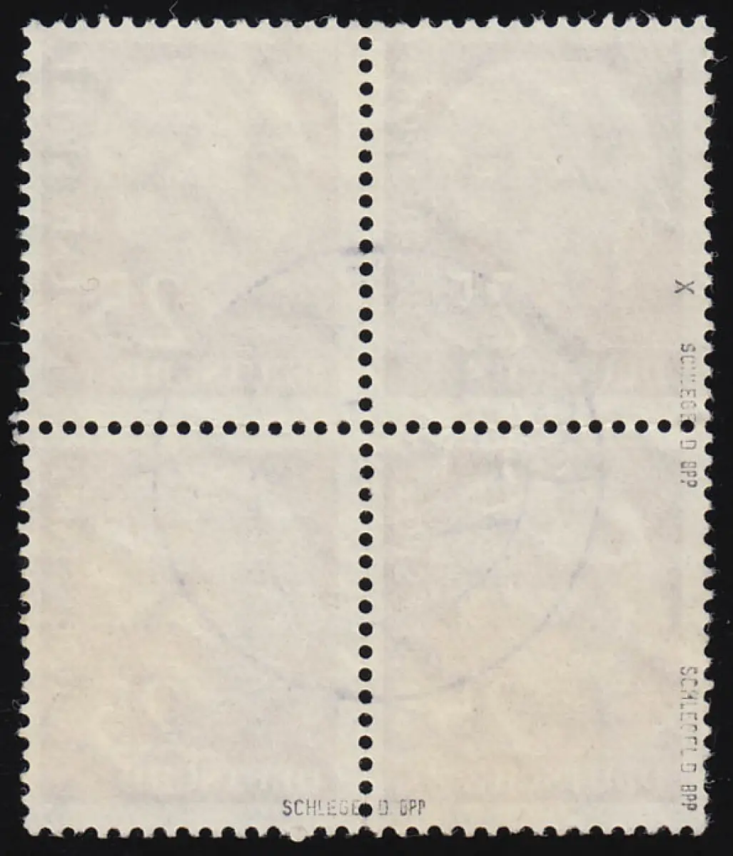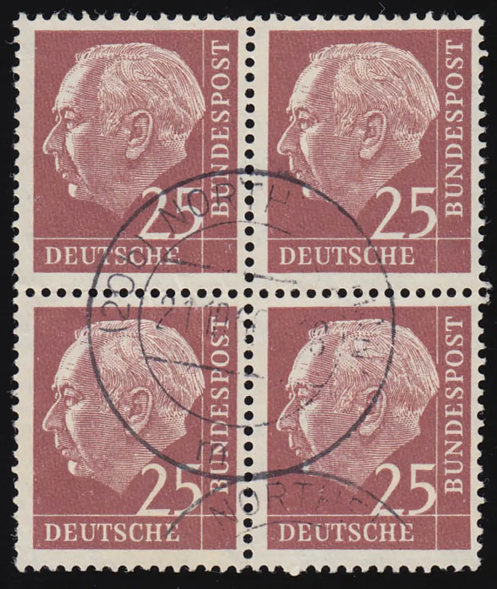 186x Heuss 25 Pf Viererblock mit lesbarem Tagesstempel O, geprüft Schlegel BPP
