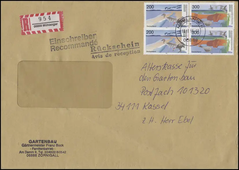 1872+1873 Boddenlandschaft-ZD 2x 200+300 Pf R-Bf + accusé de réception MÜHLANGER 13.11.96