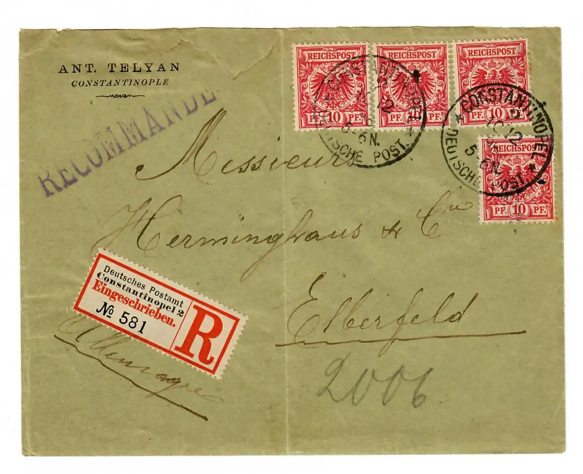 1889/94: 10 Pfg Couronne/Aigle 4x comme coureur, lettre R Constantinople-Elberfeld