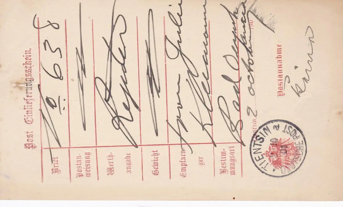 1901: Deutsche Post Tientsin: Billet d'entrée
