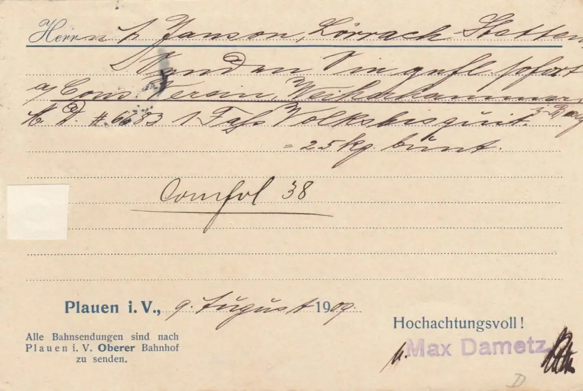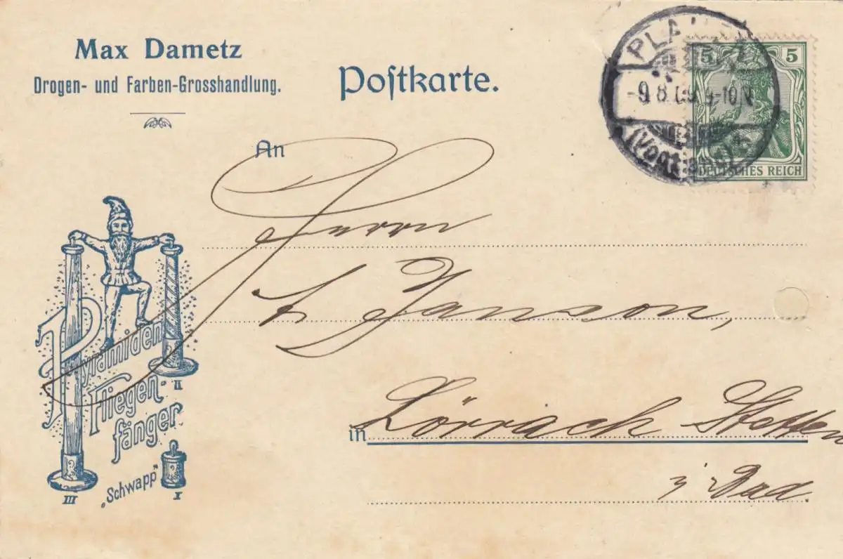 1909: Carte postale de la drogue et des couleurs de Plauen après Lörrach