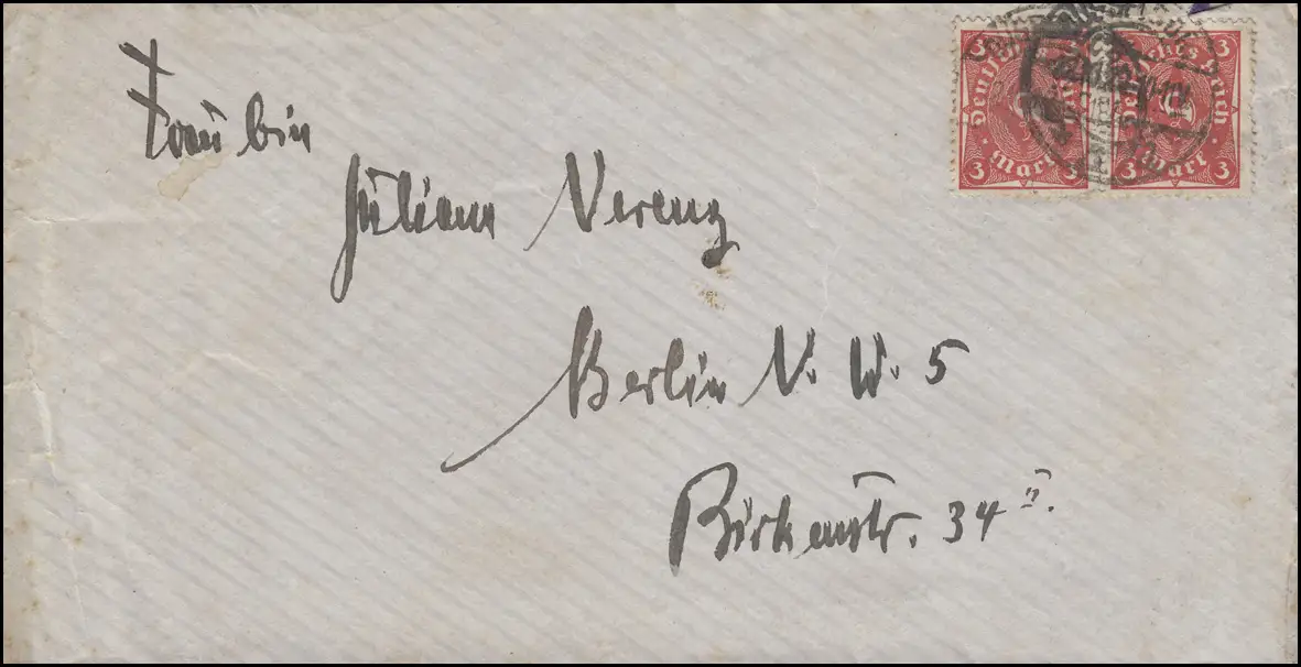 191 Posthorn en couple MeF lettre de porto juste DÜSSELDORF 12.10.1922 à Berlin